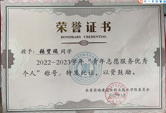 作为一名班长,该生以身作则,用心协助辅导员管理好班级事务,做好老师与同学们之间的桥梁,热心帮助同学解决一些在学习和生活上的问题。他始终秉持“奉献、友爱、互助、进步”的志愿者精神,积极参加疫情期间核酸志愿者、暑期三下乡等志愿服务工作,并在2023年3月荣获2022年-2023年“青年志愿服务优秀个人”荣誉称号。他在实践中积累经验,展现当代青年的意气风发,尽自己的能力为社会奉献力量,用自己的辛勤与汗水,浇筑一颗颗丰硕的果实。