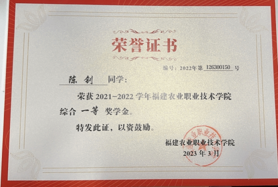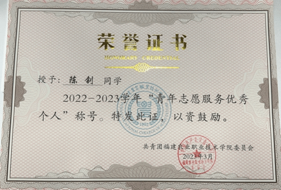 该生自入学以来积极参与志愿服务活动,多次协助侯家斌小学支教、核酸检测、良镇中学支教等志愿活动,累计志愿时长306.61小时,并在2022年参加“畲临其境,筑梦青春”乡村振兴实践团走进泉州市德化县龙塔畲族村开展暑期“三下乡”社会实践。不断在实践中提高自己的综合素质,荣获2021-2022学年校“三好学生”荣誉称号;2022-2023学年“青年志愿服务优秀个人”荣誉称号等多项荣誉。