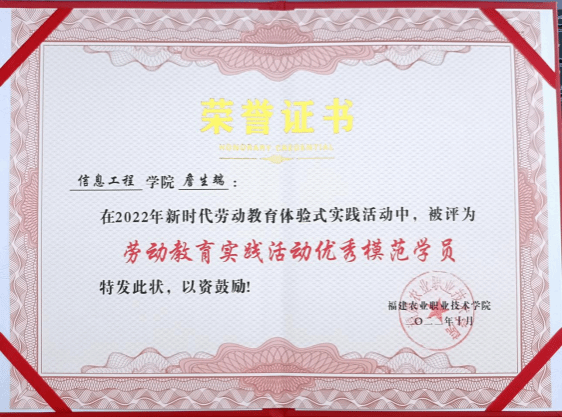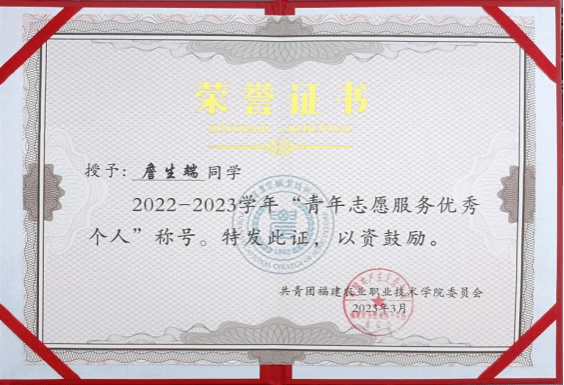 该同志奉献意识、责任意识较强,在志愿服务秉承着“哪里有需要就往哪里上”的精神,在学院疫情防控工作中共参与了十九次的核酸检测志愿者,其中参与组织核酸检测工作共十一次。在社会实践活动中,积极参与全国大中专学生志愿者暑期文化科技卫生“三下乡”社会实践活动,赴泉州市德化县龙塔畲族村进行志愿服务,所在团队被共青团中央评为“优秀团队”。志愿服务的经历,有效激发了他心中爱心种子萌发出芽,思想上得到了升华,学会了关爱他人,更深刻领会到了社会发展的需要。