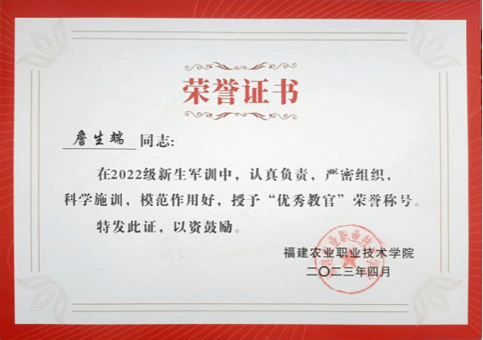 该同志自退役复学以来积极保持部队优良作风,思想上坚定不移跟随中国共产党的政策方针、路线走,该同志深学细悟党的理论知识与习近平总书记重要讲话精神,以实际行动去践行初心使命,在日常的学习、工作、及生活各方面起到示范引领作用。在校期间获得了bat365在线登录网站注册赠送362022级新生军训“优秀教官”荣誉称号、bat365在线登录网站注册赠送36“青年志愿服务优秀个人”荣誉称号、bat365在线登录网站注册赠送36“劳动教育实践活动优秀模范学员”荣誉称号、bat365在线登录网站注册赠送36“三好学生”荣誉称号、bat365在线登录网站注册赠送36“优秀共青团干部”荣誉称号等多项个人荣誉。