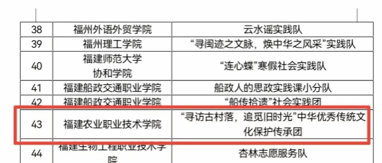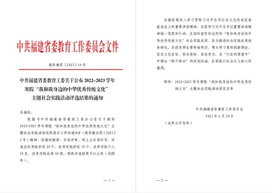 为深入学习贯彻党的二十大精神,推动青年深入了解国情、世情、民情,进一步增进对中华民族发展史的学习理解,推进文化自信自强。我院团委于2022-2023年寒假组织开展了“我和我身边的中华优秀传统文化”主题社会实践活动,近日,省教工委公布活动评选结果,我院“‘寻访古村落,追觅旧时光’中华优秀传统文化保护传承团”荣获优秀实践团队。