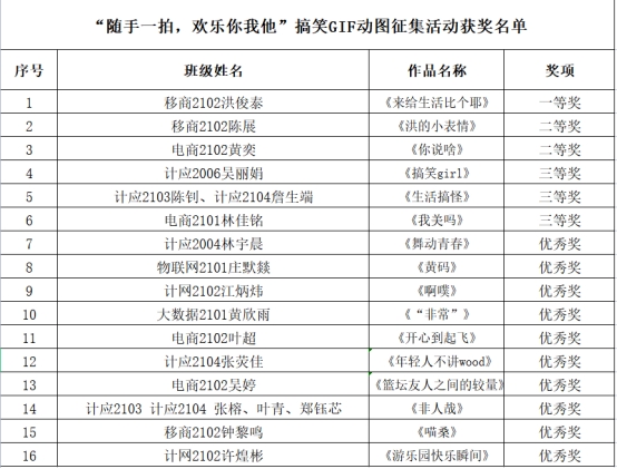 此次活动赢得了同学们的广泛参与,通过镜头捕捉美好,配以幽默风趣的文字,精心制作了属于自己的作品,每个作品别具一格,富有创意,给大家带来了许多欢乐。评审小组秉承着公平公正的原则对每一份作品进行认真的审核,从思想创新、积极向上、整体效果多个方面进行评分,最终评选出一等奖1名,二等奖2名,三等奖3名,优秀奖10名。