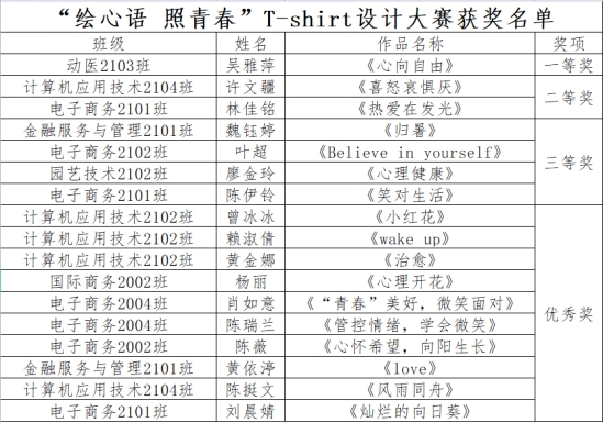 本次T-shirt设计比赛和“情绪怪兽”心灵涂鸦活动得到广大师生的广泛参与。“情绪怪兽”活动中,来往的老师同学们纷纷驻足,拿起画笔,按照心中所想肆意涂鸦、纾解心绪、寄语未来 。在T-shirt设计比赛中,参赛选手们用艳丽色彩绘制了富含时尚个性与创意设计的T-shirt设计图案,不仅向全校师生科普宣传了心理保健的重要性,还积极展示出了当代青年乐观向上、追求进步的生活态度。此次比赛,评审小组秉着公平公正的原则对每一份作品进行认真地审核,最终评选出一等奖1名,二等奖2名,三等奖4名,优秀奖10名。以下是获奖名单: