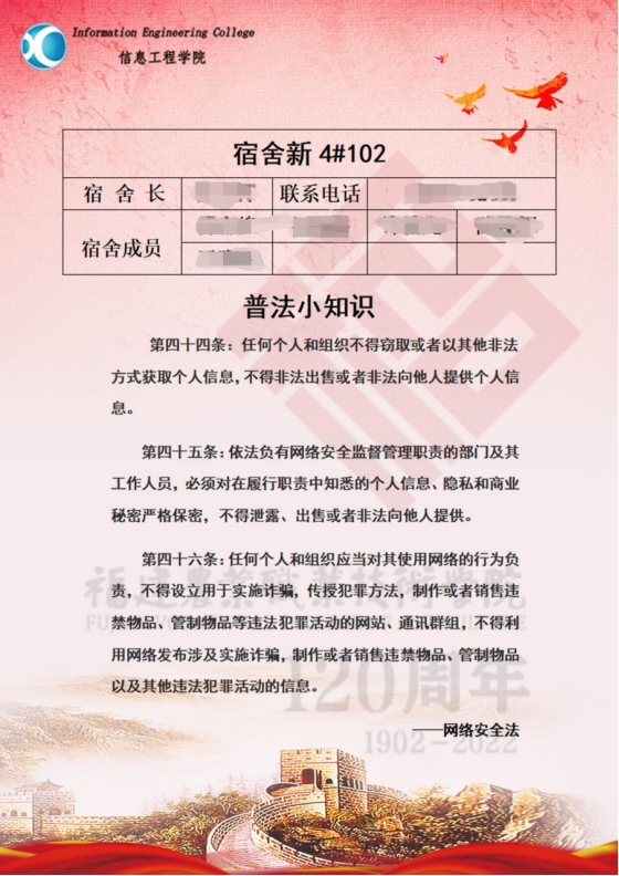 我院安排工作人员统计6号宿舍楼、新4号宿舍楼门牌缺失情况,更新宿舍各成员信息,建立人员信息卡及关于国家安全、网络安全、反恐防暴、和消防安全等方面相关宣传语上墙。