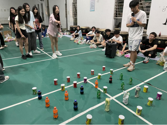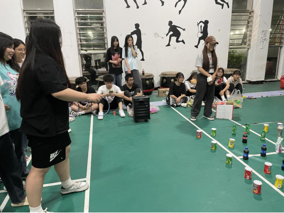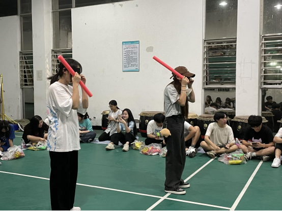 活动伊始,全体同学围圈就坐,由击鼓传花作为热场游戏,游戏中同学们聚精会神留意击鼓棒的位置,在鼓声停止时,被选中的同学上台表演节目。在下一场游戏你画我猜中,两个班各出两个人为一小组,由主持人在画板上画下成语,小组成员合力猜出迷题,猜题个数多者胜,各班同学也按耐不住,纷纷举起手来为自己班的小组添分,充分展现了班级凝聚力。多轮游戏比拼后同学们越战越勇,蒙眼大战中两队派出的男生之间展开猛烈的进攻,而参与的女生们也是巾帼不让须眉,最后一组取得最终胜利。我们的活动也在欢声笑语中接近了尾声。