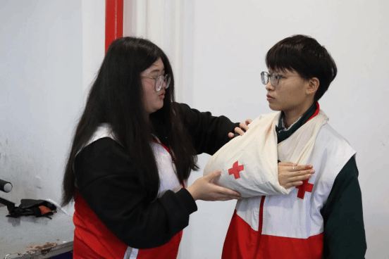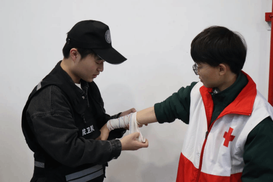 为确保演练安全、快速、有序。演练前学院制定了应急逃生演练方案,严格落实方案内容,精心布置演练工作。各班安全员开展主题班会,讲解注意事项,熟悉逃生疏散路线。本次演练模仿发生地震场景,随着第一声警报声响起,同学们迅速低头弯腰双手护住头部蹲在桌子旁,当第二声警报响起后同学们听从现场工作人员的指挥,靠楼梯左侧成一路纵队按规定路线向指定地点有序转移,按照疏散标志和路线,从就近安全出口疏散,在疏散过程中保护头部、预防踩踏,安全到达指定地点。在演练结束后,我院党总支副书记张宏对此次演练进行总结,他强调了防震逃生知识和技能的重要性,并希望同学们能够将这些知识运用到日常生活中,时刻保持警惕,做好自我保护。随后,各班级安全员、宿舍长和院卫队在红十字会成员的带领下,学习了环形包扎法、巴氏包扎法和三角巾包扎法等基本包扎法,使在场师生掌握正确的救治技能,以期达到“挽救生命,减轻伤残”的目的,为健康成长、安全生活提供必要的急救自救保障。